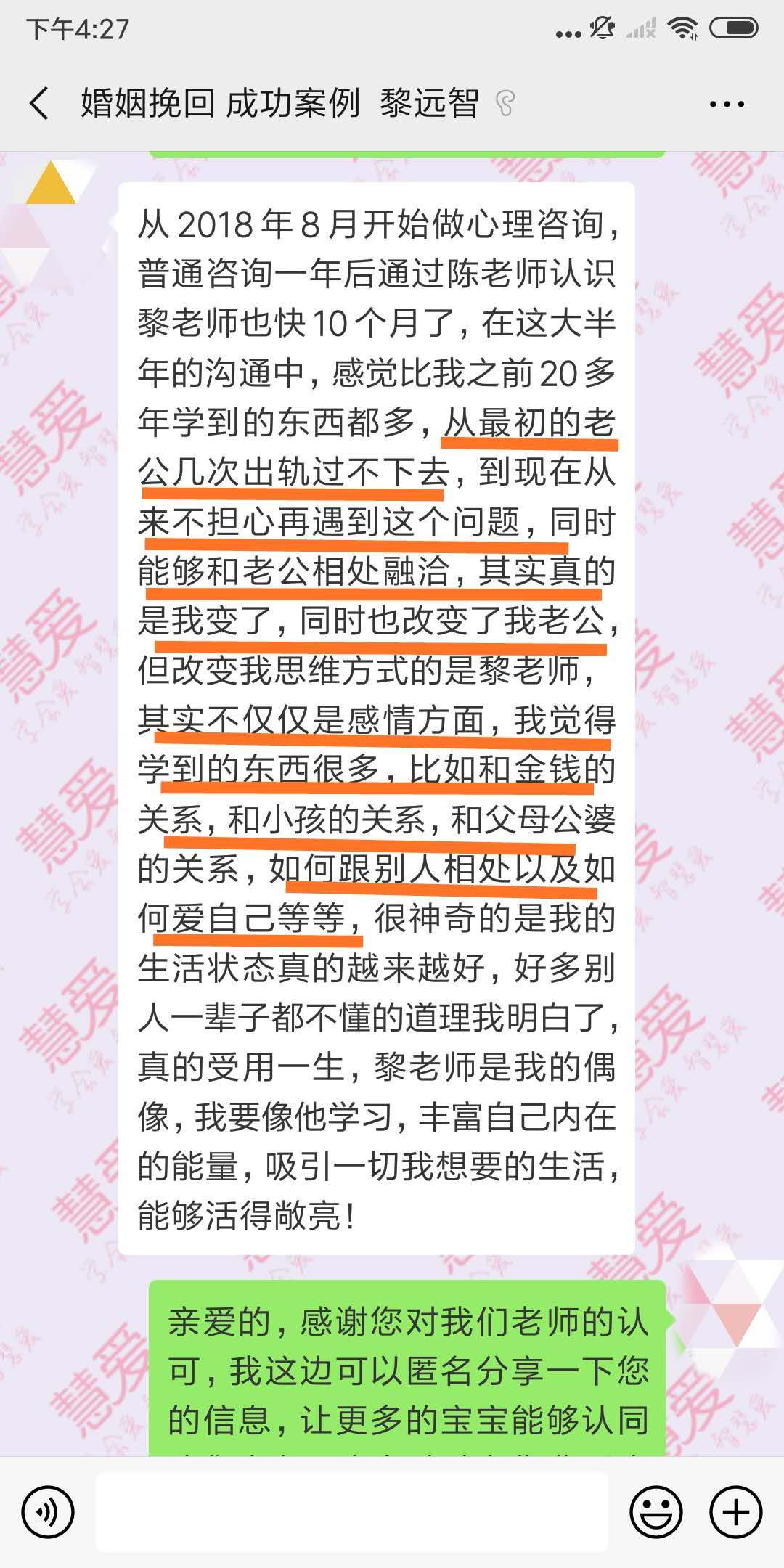 咨询后: 咨询了一个多月,发生了两个最大的转变:老公第一次精心准备了情人节礼物,第一次主动并且用心规划了长途旅行。知道了自己和丈夫的爱语都是陪伴,学会了非暴力沟通,婆媳关系也越来越和谐。